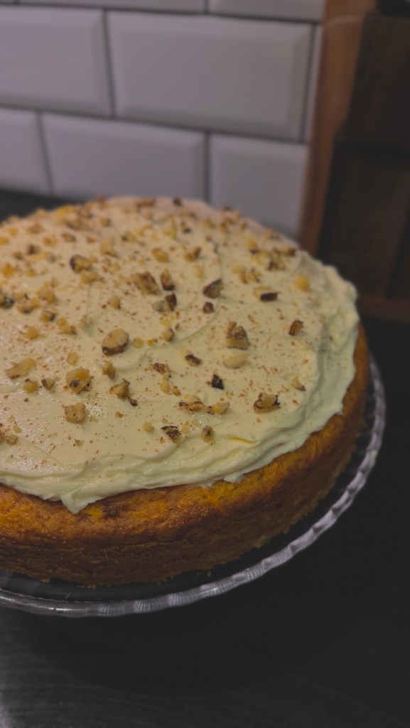 După ce am întins crema, am presărat un praf de mixed spice pentru aromă, apoi am adăugat deasupra nucile prăjite și tocate, care dau un gust crocant și minunat prăjiturii.